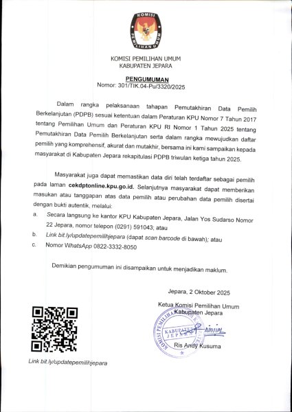 KPU Kabupaten Jepara telah melaksanakan Rapat Pleno Terbuka Rekapitulasi Pemutakhiran Data Pemilih Berkelanjutan Triwulan III Tahun 2025, Kamis (2/10/2025), di Aula KPU Kabupaten Jepara. Hasil rapat pleo dituangkan dalam bentuk Keputusan KPU Kabupaten Jepara Nomor 42 Tahun 2025.