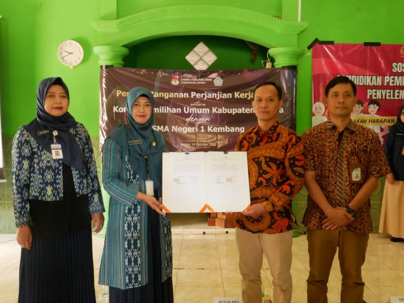Naskah kerja sama ditandatangani oleh Ketua KPU Kabupaten Jepara Ris Andy Kusuma dan Kepala SMA Negeri 1 Kembang Puji Ningrum. Penandatanganan ini disaksikan oleh anggota KPU Jepara Muhammadun, serta jajaran guru dan siswa.