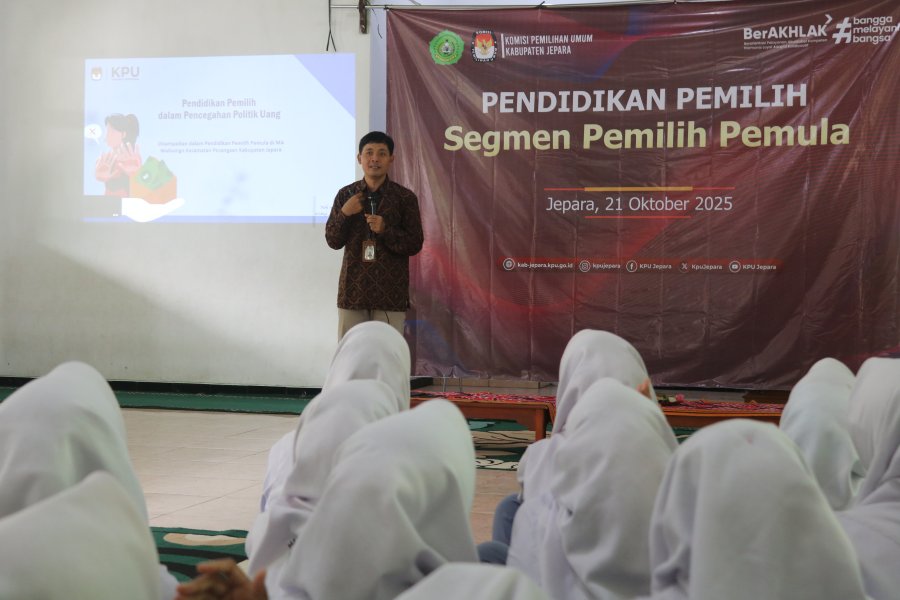 Kab-jepara.kpu.go.id – Menjadi pemilih cerdas berarti menolak segala bentuk praktik politik uang. Pesan itu disampaikan Anggota KPU Kabupaten Jepara Muhammadun saat menjadi narasumber dalam kegiatan Pendidikan Pemilih Segmen Pemilih Pemula di MA Walisongo Pecangaan, Selasa (21/10/2025).