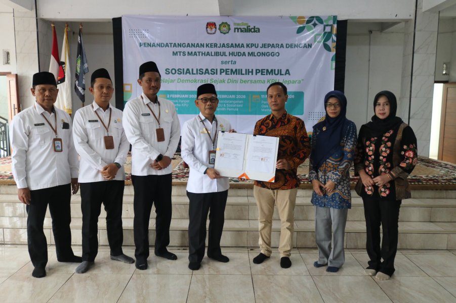 kab-jepara.kpu.go.id – Komisi Pemilihan Umum (KPU) Kabupaten Jepara menandatangani perjanjian kerja sama dengan MTs Matholibul Huda Kecamatan Mlonggo sebagai upaya penguatan pendidikan demokrasi bagi pemilih pemula. Kegiatan ini dilaksanakan di aula MTs Matholibul Huda, Senin (9/2/2026).