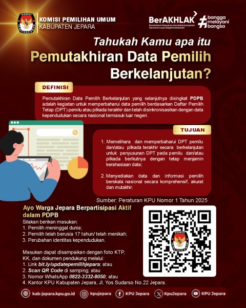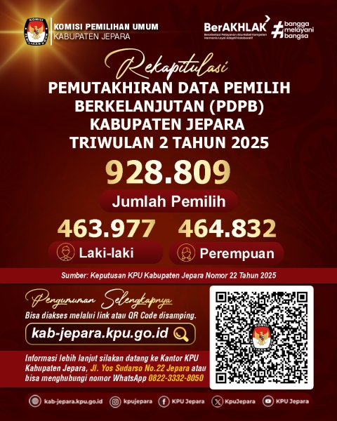 Kab-jepara.kpu.go.id – Sampai dengan triwulan kedua 2025, jumlah pemilih dalam pemutakhiran daftar pemilih berkelanjutan (PDPB) terbaru di Kabupaten Jepara menunjukkan peningkatan dibandingkan dengan daftar pemilih tetap (DPT) pada Pilkada 2024. Peningkatan jumlah pemilih ini disebabkan oleh berbagai faktor, antara lain penambahan penduduk yang telah memenuhi syarat menjadi pemilih, perubahan data kependudukan, dan perubahan status penduduk. Berdasarkan rekapitulasi PDPB triwulan kedua 2025 yang telah dilaksanakan Komisi Pemilihan Umum (KPU) Kabupaten Jepara pada 2 Juli 2025, di Jepara saat ini ada 928.809 pemilih. Jumlah tersebut meningkat 1,04 persen jika dibandingkan dengan DPT Pilkada 2024 yang berjumlah 919.276 pemilih. Ketua Divisi Perencanaan, Data dan Informasi KPU Kabupaten Jepara Siti Nurwakhidatun menyampaikan bahwa KPU Jepara telah menerima data pemilih dari KPU RI yang merupakan hasil sinkronisasi dengan data kependudukan Kementerian Dalam Negeri (Kemendagri). “Data yang kami terima dari KPU RI selanjutnya kami cermati dan olah melalui aplikasi Sidalih (Sistem Informasi Data Pemilih-Red) untuk memastikan tidak ada data ganda dan tidak valid,” terang Siti. Ia menjelaskan, sampai dengan triwulan kedua 2025, terdapat pemilih baru sebanyak 12.143 pemilih, tidak memenuhi syarat (2.610 pemilih), dan perbaikan elemen data (7.777 pemilih). Kategori pemilih baru antara lain penduduk yang telah berusia 17 tahun atau telah menikah dan perubahan status anggota TNI/Polri menjadi warga sipil. Pemilih tidak memenuhi syarat antara lain pemilih yang telah meninggal dunia, penduduk sipil yang menjadi TNI/Polri, dan penduduk yang pindah domisili keluar dari Kabupaten Jepara. Sedangkan perubahan elemen data pemilih di antaranya perubahan nomor Kartu Keluarga (KK), perubahan status perkawinan, dan perbaikan data kependudukan. Anggota KPU Kabupaten Jepara Muhammadun mengatakan, untuk mendukung peningkatan kualitas data pemilih yang mutakhir, KPU Jepara terus berupaya melakukan sosialisasi serta menjaring masukan dari masyarakat dan instansi terkait. Sosialisasi ini untuk meningkatkan kesadaran dan partisipasi masyarakat dalam proses pemilu dan pilkada. "Kami ingin memastikan masyarakat memahami pentingnya PDPB dan bagaimana mereka dapat memastikan bahwa data pemilih mereka akurat dan terkini. Dengan demikian, kita dapat meningkatkan kualitas proses pemilu dan pilkada mendatang," kata Muhammadun, ketua Divisi Sosialisasi, Pendidikan Pemilih, Partisipasi Masyarakat dan Sumber Daya Manusia, Kamis (3/7/2025). KPU Jepara telah berkoordinasi dengan berbagai pihak untuk mendukung pemutakhiran data pemilih, di antaranya Bawaslu Jepara, Disdukcapil Jepara, Polres Jepara, Kodim 0719/Jepara, Rutan Kelas II B Jepara, serta instansi terkait lainnya. KPU Jepara juga telah bersurat kepada Bupati Jepara untuk menerbitkan surat edaran bagi pemerintah tingkat desa/kelurahan dan kecamatan terkait sosialisasi PDPB agar dapat disampaikan kepada masyarakat sampai level desa/kelurahan. “Ke depan, kami berencana akan berkoordinasi dengan lembaga pendidikan dan Diskominfo untuk meningkatkan sosialisasi PDPB agar informasi terkait proses pemutakhiran ini dapat lebih dijangkau masyarakat luas,” imbuh Muhammadun. Masyarakat, lanjut dia, dapat memastikan dirinya telah terdaftar sebagai pemilih melalui laman cekdptonline.kpu.go.id serta dapat memberikan masukan atau tanggapan atas data pemilih dan perubahan data pemilih disertai dengan bukti otentik secara langsung ke kantor KPU Kabupaten Jepara, link bit.ly/updatepemilihjepara, atau nomor WhatsApp 0822-3332-8050. KPU Jepara berharap dengan adanya partisipasi aktif dari masyarakat, data pemilih menjadi lebih mutakhir dan akurat. (kpujepara)