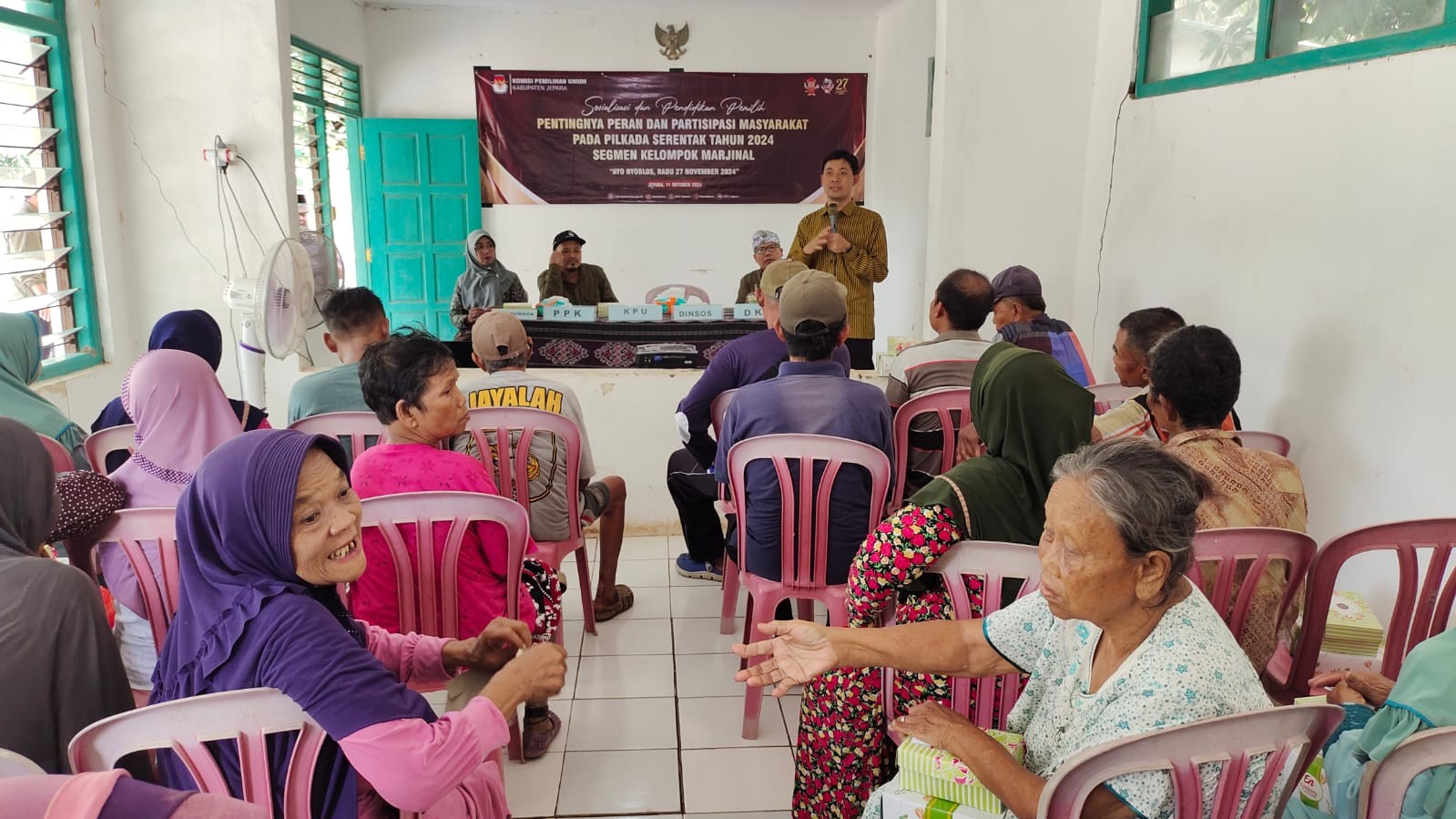 Kab-jepara.kpu.go.id – KPU Kabupaten Jepara menyosialisasikan tahapan Pilkada 2024 kepada warga yang menempati Lingkungan Pondok Sosial (Liposos) Paca yang berlokasi di Desa Banyumanis Kecamatan Donorojo, Jumat (11/10). KPU menyosialisasikan informasi pilkada ke berbagai segmen pemilih, salah satunya ke warga yang pernah menderita kusta tersebut. Mereka punya hak pilih dan siap berpartisipasi pada Pilkada 2024 nanti. Hadir dalam kegiatan tersebut Ketua Divisi Sosialisasi, Pendidikan Pemilih, Partisipasi Masyarakat dan SDM KPU Kabupaten Jepara Muhammadun, didampingi Panitia Pemilihan Kecamatan (PPK) Donorojo. Kegiatan tersebut menghadirkan dua narasumber, yaitu R Bambang Hernantya dari Dinsosnakertrans dan Dian Susianto dari Dinas Kesehatan Kabupaten (DKK) Jepara. Muhammadun menyampaikan bahwa tak lama lagi pemungutan suara atau coblosan Pilkada 2024 akan dilaksanakan, yaitu pada 27 November. “Warga yang tinggal di Liposos sudah berpartisipasi pada Pemilu 2024, dan nanti di pilkada kami berharap berpartisipasi penuh,” kata Muhammadun. Ia menjelaskan tahapan yang sedang berjalan saat ini, yaitu tahapan kampanye. Muhammadun menjelaskan bahwa pada pilkada di Jepara ini pemilih akan memilih calon gubernur dan wakil gubernur Jawa Tengah serta calon bupati dan wakil bupati Jepara. Sementara itu Bambang Hernantya menyampaikan Dinsosnakertrans berkoordinasi dengan KPU terkait keperluan admisistrasi hak konstitusi warga Liposos Paca untuk memastikan hak pilih warga Liposos terjamin. “Masyarakat di Liposos Paca memiliki hak yang sama sebagai warga negara Indonesia sehingga mesti berpartisipasi dalam pilkada dengan menyalurkan hak pilih,” kata Bambang. Sementara itu Dian Susianto menyatakan warga Liposos Paca memperoleh pelayanan kesehatan secara menyeluruh, terutama sebagai kelompok marginal. “penting untuk memupuk rasa percaya diri dan ikut serta dalam suksesnya Pilkada 2024 untuk memilih pemimpin yang berkualitas untuk memajukan Jepara dan Jawa Tengah,” kata dia. (kpujepara)