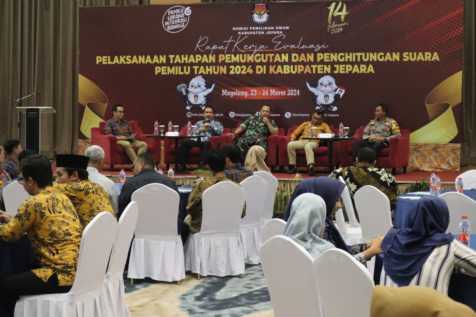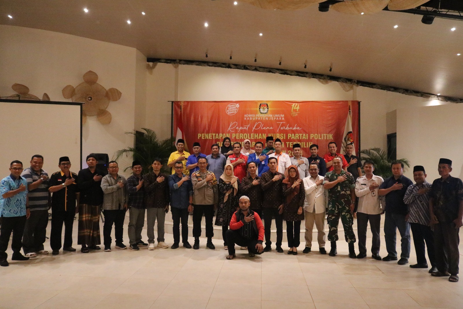 Kab-jepara.kpu.go.id — Komisi Pemilihan Umum (KPU) Kabupaten Jepara menggelar Rapat Pleno Terbuka Penetapan Perolehan Kursi Partai Politik dan Penetapan Calon Terpilih pada Pemilu Tahun 2024. Acara tersebut berlangsung di Eat and Meet Restaurant Jepara pada Kamis (2/5/2024). Hadir Ketua KPU Kabupaten Jepara Ris Andy Kusuma, beserta empat komisioner lainnya, yakni Haris Budiawan, Muhammadun, Siti Nurwakhidatun dan Siti Suryani. Hadir juga Sekretaris KPU Kabupaten Jepara, Yuyun Sri Agung beserta jajaran sekretariat. Hadir Ketua Bawaslu Sujiantoko dan anggota Khomaru Zaman. Asisten Pemerintahan dan Kesra Setda Kabupaten Jepara Ratib Zaini, hadir dan memberikan sambutan mewakili Pj Bupati Jepara. Selain itu hadir pula seluruh jajaran Forkopimda, Bawaslu dan perwakilan dari Partai Politik Peserta Pemilu Tahun 2024. Ris Andy Kusuma dalam sambutannya mengatakan bahwa acara tersebut merupakan tahap akhir dari proses penghitungan suara pada Pemilu Tahun 2024. Ris Andy juga menyampaikan terima kasih kepada seluruh pihak yang telah membantu mensukseskan pemilu di Kabupaten Jepara, sehingga pemilu berjalan dengan lancar dan damai, serta tidak ada sengketa di Kabupaten Jepara. Acara dilanjutkan dengan pembacaan Penetapan Perolehan Kursi Partai Politik dan Penetapan Calon Terpilih pada Pemilu Tahun 2024 di Kabupaten Jepara, kemudian dilakukan penandatanganan Surat Keputusan dan Berita Acara oleh Komisoner KPU Kabupaten Jepara. KPU Kabupaten menetapkan dua keputusan, yaitu Keputusan KPU Kabupaten Jepara Nomor 871 tahun 2024 tentang Penetapan Perolehan Kursi Partai Politik Peserta Pemilihan Umum Anggota Dewan Perwakilan Rakyat Daerah Kabupaten Jepara dalam Pemilihan Umum tahun 2024, dan Keputusan KPU Kabupaten Jepara Nomor 872 tahun 2024 tentang Penetapan Calon Terpilih Anggota Dewan Perwakilan Rakyat Daerah Kabupaten Jepara dalam Pemilihan Umum Tahun 2024. Dalam kesempatan itu, perwakilan dari DPC PDI Perjuangan menyampaikan adanya salah satu calon terpilih yang mengundurkan diri. KPU merespons dan akan menindaklanjutinya sebagaimana ketentuan dalam PKPU Nomor 6 tahun 2024, juga surat dinas KPU untuk mengklarifikasi parpol terkait. Klarifikasi dilakukan pada Jumat (3/5) di Kantor KPU. (kpujepara)