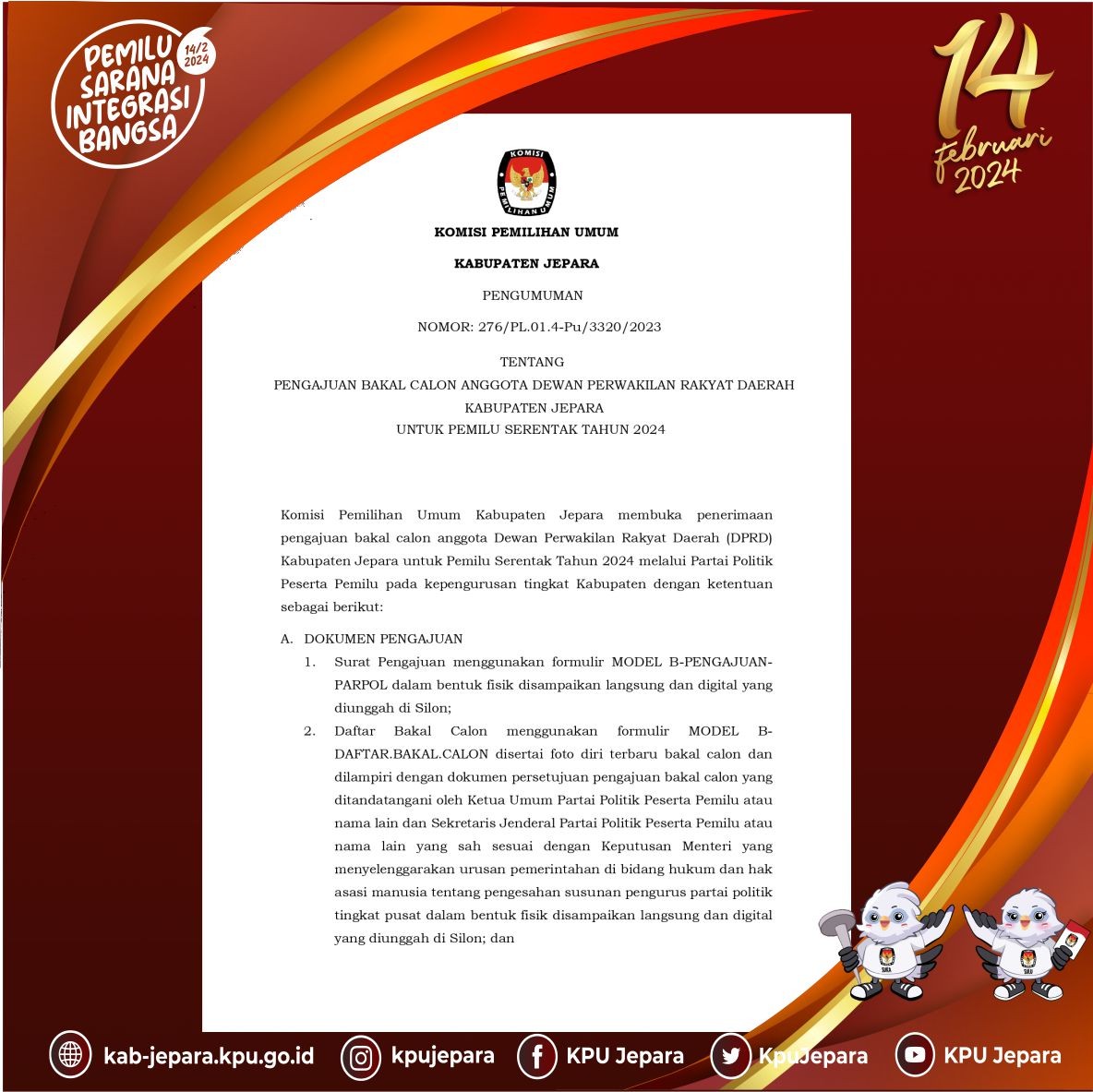 Kab-jepara.kpu.go.id - Komisi Pemilihan Umum (KPU) Kabupaten Jepara membuka penerimaan pengajuan bakal calon anggota Dewan Perwakilan Daerah (DPRD) untuk Pemilu 2024. Hal tersebut tertuang dalam pegumuman Nomor 276/2023 yang telah diumumkan KPU Jepara mengenai pengajuan bakal calon anggota DPRD Kabupaten Jepara, Senin (24/3/2023). Isi pengumuman dapat diakses melalui bit.ly/pengumumankpujepara Muhammadun, anggota KPU Kabupaten Jepara Divisi Sosialisasi, Pendidikan Pemilih, Partisipasi Masyarakat, dan SDM, Senin (24/5) menyampaikan KPU RI telah menerbitkan Peraturan KPU Nomor 10 Tahun 2023 tentang Pencalonan Anggota Dewan Perwakilan Rakyat, Dewan Perwakilan Rakyat Daerah Provinsi dan Dewan Perwakilan Rakyat Daerah Kabupaten/Kota pada 19 April 2023. “Lampiran I Peraturan KPU tersebut mengatur program dan jadwal kegiatan tahapan pencalonan. KPU kabupaten/kota, sebagaimana ketentuan dalam Padal 29 PKPU Nomor 10/2023 itu mengumumkan pengajuan bakal calon. Adapun jadwal pengumuman yaitu 24-30 April 2023. Dalam pasal yang sama juga diatur bahwa, untuk KPU kabupaten, pengumuman dilakukan melalui laman KPU kabupaten/kota. Dalam hal ini sudah kami umumkan di kab-jepara.kpu.go.id dan diunggah ke akun resmi media sosial KPU Jepara," kata Muhammadun. Ia menjelaskan, terdapat beberapa dokumen pengajuan yang harus dilengkapi partai politik saat mengajukan pencalonan bakal calon. Pertama, surat pengajuan menggunakan formulir MODEL B-PENGAJUAN-PARPOL. Kedua, daftar bakal calon yang disampaikan menggunakan formulir MODEL B-DAFTAR.BAKAL.CALON disertai foto diri terbaru bakal calon dan dilampiri dengan dokumen pengajuan bakal calon yang ditandatangani oleh Ketua Umum Partai Politik Peserta Pemilu atau nama lain dan Sekretaris Jenderal Partai Politik Peserta Pemilu atau nama lain yang sah sesuai dengan Keputusan Menteri yang menyelenggarakan urusan pemerintahan di bidang hukum dan hak asasi manusia tentang pengesahan susunan pengurus partai politik tingkat pusat. Selain itu tedapat dokumen persyaratan administrasi lainnya untuk bakal calon sebagaimana dimaksud dalam Pasal 12 sampai dengan Pasal 23 PKPU Nomor 10 Tahun 2023. Muhammadun menjelaskan KPU akan segera membuka akses partai politik ke Sistem Informasi Pencalonan atau Silon sebelum masa tahapan pengajuan bakal calon anggota legislatif dimulai pada 1-14 Mei mendatang. “Seluruh dokumen persyaratan pengajuan akan diunggah melalui Silon nantinnya,” ujar Muhammadun. Jadi nantinya bakal calon hanya perlu menyampaikan secara fisik dua dokumen, yaitu formulir MODEL B-PENGAJUAN-PARPOL dan formulir MODEL B-DAFTAR.BAKAL.CALON. Untuk waktu pengajuan bakal calon, disampaikan di Kantor KPU Kabupaten Jepara pada 1-14 Mei 2023. "Terkait jadwal pelayanannya, pada 1-13 Mei kami melayani pukul 08.00 – 16.00 Wib. Sedangkan untuk tanggal 14 Mei kami melayani pengajuan bakal calon pukul 08.00 – 23.59 Wib," kata Muhammadun. Untuk pengajuan bakal calon, hal tersebut dilakukan oleh ketua partai politik peserta pemilu pada kepengurusan tingkat kabupaten atau nama lain dan sekretaris partai politik peserta pemilu pada kepengurusan tingkat kabupaten. Muhammadun mengungkapkan terkait proses pengajuan bakal calon DPRD ini KPU Kabupaten Jepara telah membuka Helpdesk sejak 18 April lalu. "Kami telah menyiapkan petugas helpdesk yang akan melayani konsultasi dan menjawab kebutuhan informasi terkait proses pengajuan bakal calon. Masyarakat maupun pihak-pihak yang terkait dengan tahapan pencalonan ini bisa terus mengikuti informasinya melalui website dan media sosial KPU Jepara," kata Muhammadun. (kpujepara)