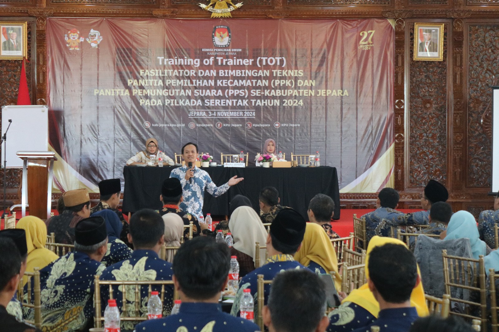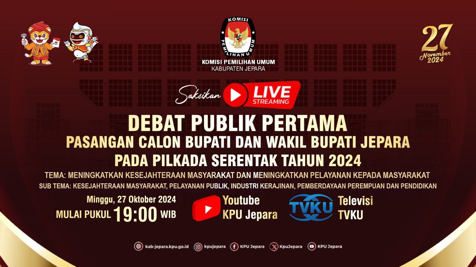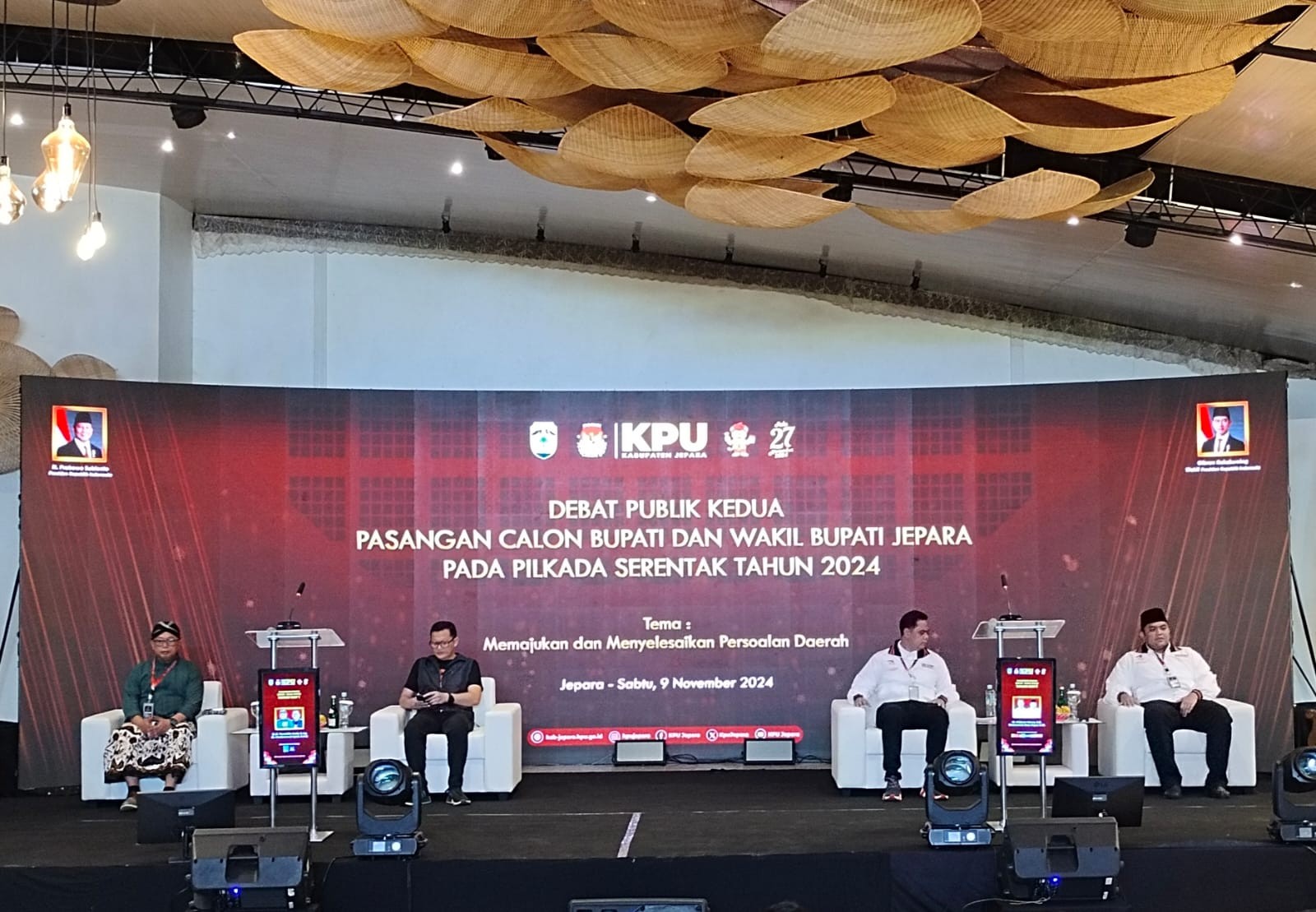 Kab-jepara.kpu.go.id – Dua pasangan calon bupati dan wakil bupati Jepara, Sabtu (9/11/2024) menyampaikan visi, misi dan program kerja mereka dalam debat terbuka kedua yang diselenggarakan KPU Kabupaten Jepara di Ballroom Eat & Meet Restaurant, Bandengan. Secara umum, debat berjalan lebih hidup. KPU masih menyiapkan debat ketiga atau yang terakhir dalam Pilkada 2024 ini pada 17 November mendatang. Debat diikuti pasangan calon bupati-wakil bupati nomor urut 1 KH Nuruddin Amin SAg - H Mochammad Iqbal SHI dan pasangan calon bupati-wakil bupati nomor urut 2 H Witiarso Utomo SE – Muhammad Ibnu Hajar SM. Tema debat kedua adalah Memajukan dan Menyelesaikan Persoalan Daerah. Mereka menjawab pertanyaan-pertanyaan yang disusun panelis yang disampaikan oleh moderator berdasarkan beberapa subtema, yaitu kapabilitas pemerintah, perkembangan wilayah, keberdayaan dan keswadayaan masyarakat. Selain itu juga subtema ekonomi, sosial budaya, Kesehatan, dan lingkungan hidup. Debat pertama dilaksanakan pada 27 Oktober lalu. Dua pasangan calon juga memaparkan visi, misi, dan program kerja. Pada debat kedua, suasana debat lebih hidup. Para pendukung dari kedua pasangan calon juga tertib, sehingga debat berlangsung khidmat. Pj Bupati Jepara Edy Supriyanta hadir bersama Forkopimda. Ketua KPU Kabupaten Jepara Ris Andi Kusuma bersama empat anggota, yaitu Haris Budiawan, Muhammadun, Siti Nurwakhidatun, dan Siti Suryani juga hadir bersama Sekretaris KPU Yuyun Sri Agung P. Ketua Bawaslu bersama anggota hadir, organisasi perangkat daerah, akademisi, disabilitas, tokoh masyarakat dan tokoh agama hadir menyaksikan secara langsung. Tim perumus dan panelis juga menghadiri debat. Puluhan wartawan meliput debat yang disiarkan secara langsung oleh MetroTV dan kanal YouTube KPU Jepara tersebut. Ketua Divisi Sosialisasi, Pendidikan Pemilih, Partisipasi Masyarakat, dan Sumber Daya Manusia (SDM) KPU Jepara Muhammadun mengatakan, sebelum pelaksanaan debat, KPU berkoordinasi secara intensif dengan pasangan calon melalui petugas penghubung, dengan lembaga penyiaran, Polres dan Kodim Jepara, serta Bawaslu. Berbagai masukan diakomodasi untuk mewujudkan suasana debat yang hidup dan lebih substantif. “Tujuan debat ini diantaranya bagaimana masyarakat bisa mengetahui visi, misi, dan program kerja. Tim perumus telah mendesain debat sedemikian rupa agar calon bupati maupun calon wakil bupati sama-sama memiliki kesempatan untuk mengeksplorasi visi, misi, dan programnya sesuai tema yang ditentukan,” kata Muhammadun. KPU bersama tim perumus, akan mengevaluasi pelaksanaan debat, serta meminta masukan dari berbagai pihak termasuk pasangan calon. Terkait pengamanan, KPU juga menerima saran dan masukan dari Polres dan Kodim. KPU mengapresiasi dukungan Polres dan Kodim dalam mengamankan jalannnya dua kali debat. “Kami berharap, debat ketiga atau yang terakhir nanti berjalan makin berkualitas dan substantif, sehingga dapat menjadi salah satu sumber rujukan pemilih dalam menentukan pilihan. Kami merangcang tiga kali debat atau sesuai jumlah maksimal agar pemilih memiliki lebih banyak kesempatan untuk menyerap informasi tentang calon pemimpinnya,” kata Muhammadun. Debat tersebut juga disaksikan secara serentak masyarakat, termasuk di semua kecamatan melalui nonton bareng yang diselenggarakan Panitia Pemilihan Kecamatan (PPK) di 16 kecamatan dengan melibatkan stakeholder setempat. (kpujepara)