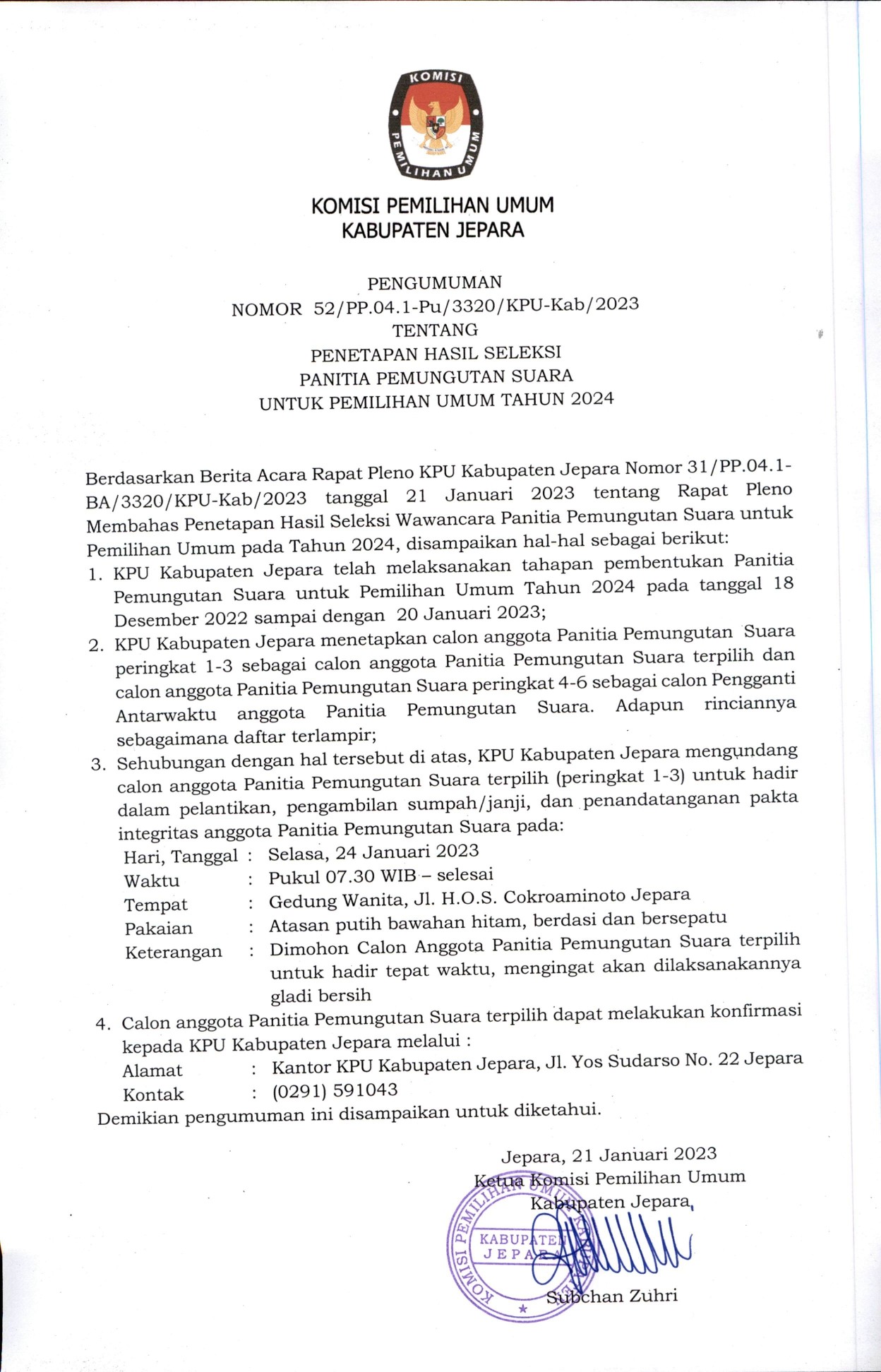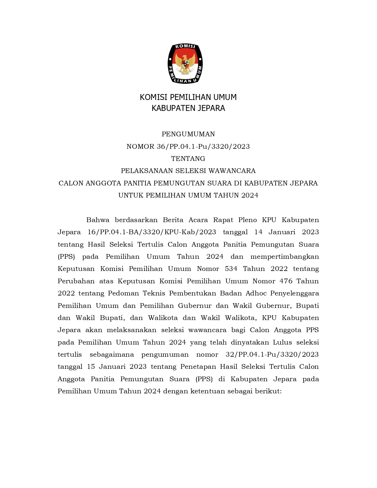 #TemanPemilih, berikut adalah pengumuman tentang pelaksanaan seleksi wawancara calon anggota panitia pemungutan suara di Kabupaten Jepara untuk pemilihan umum Tahun 2024.