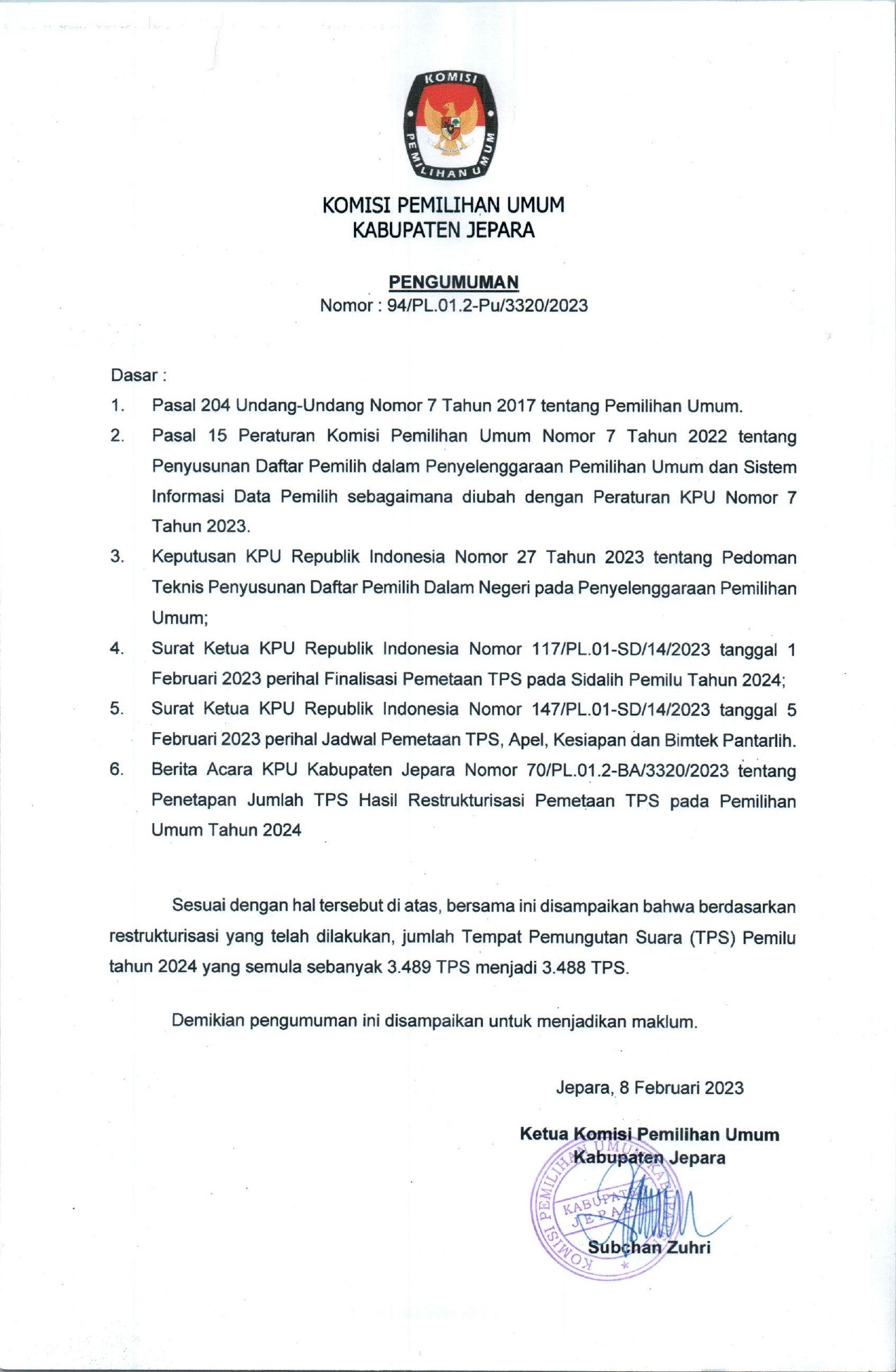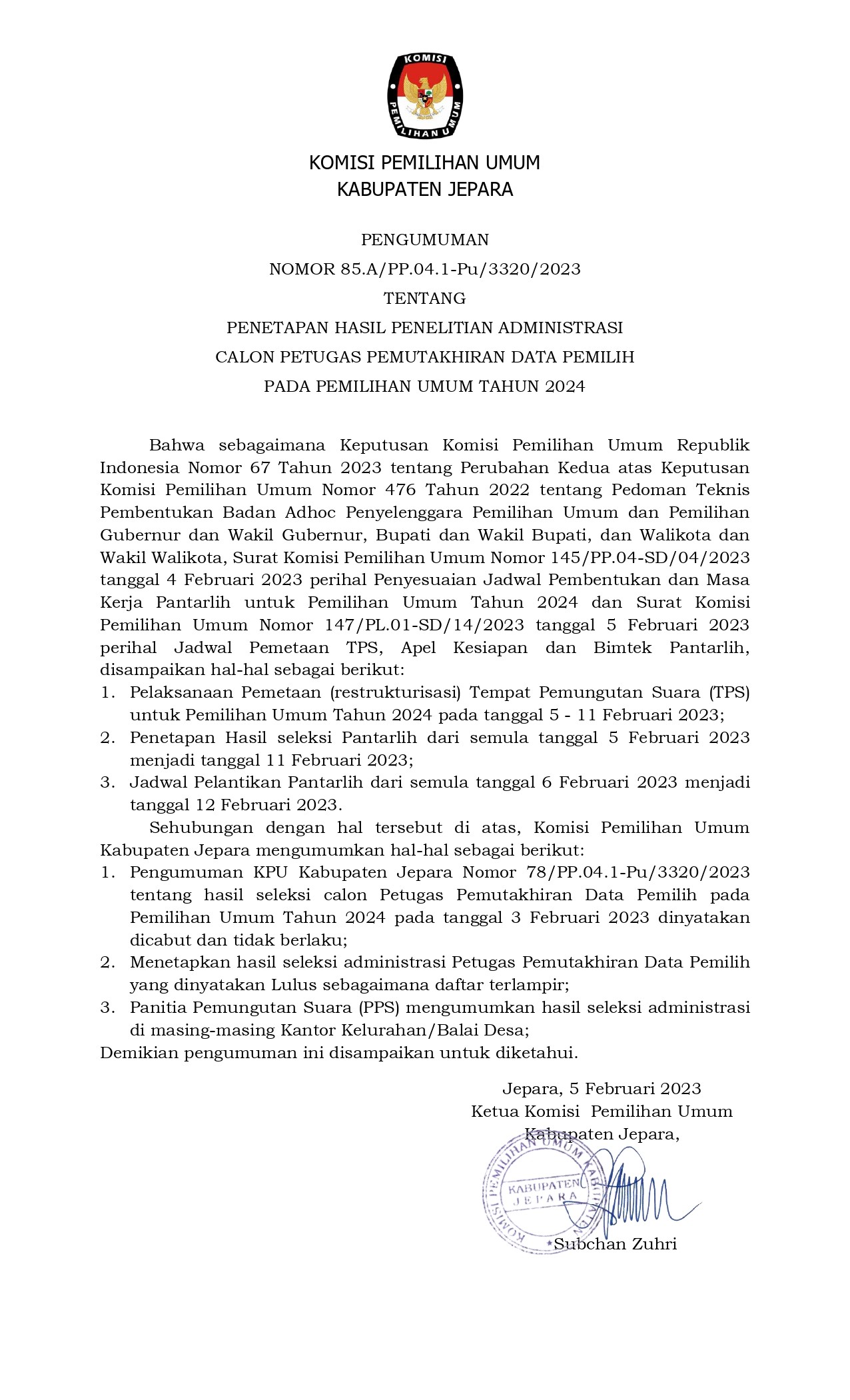 #TemanPemilih, berikut adalah Pengumuman Penetapan Hasil Seleksi Calon Petugas Pemutakhiran Data Pemilih Pada Pemilihan Umum Tahun 2024.