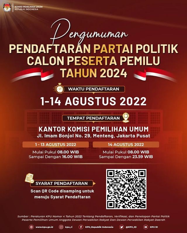 #TemanPemilih, kamu harus tahu, tanggal 1-14 Agustus 2022 adalah masa pendaftaran partai politik calon peserta Pemilu 2024. Mau tahu apa saja persyaratannya? Scan barcodenya aja yaa..