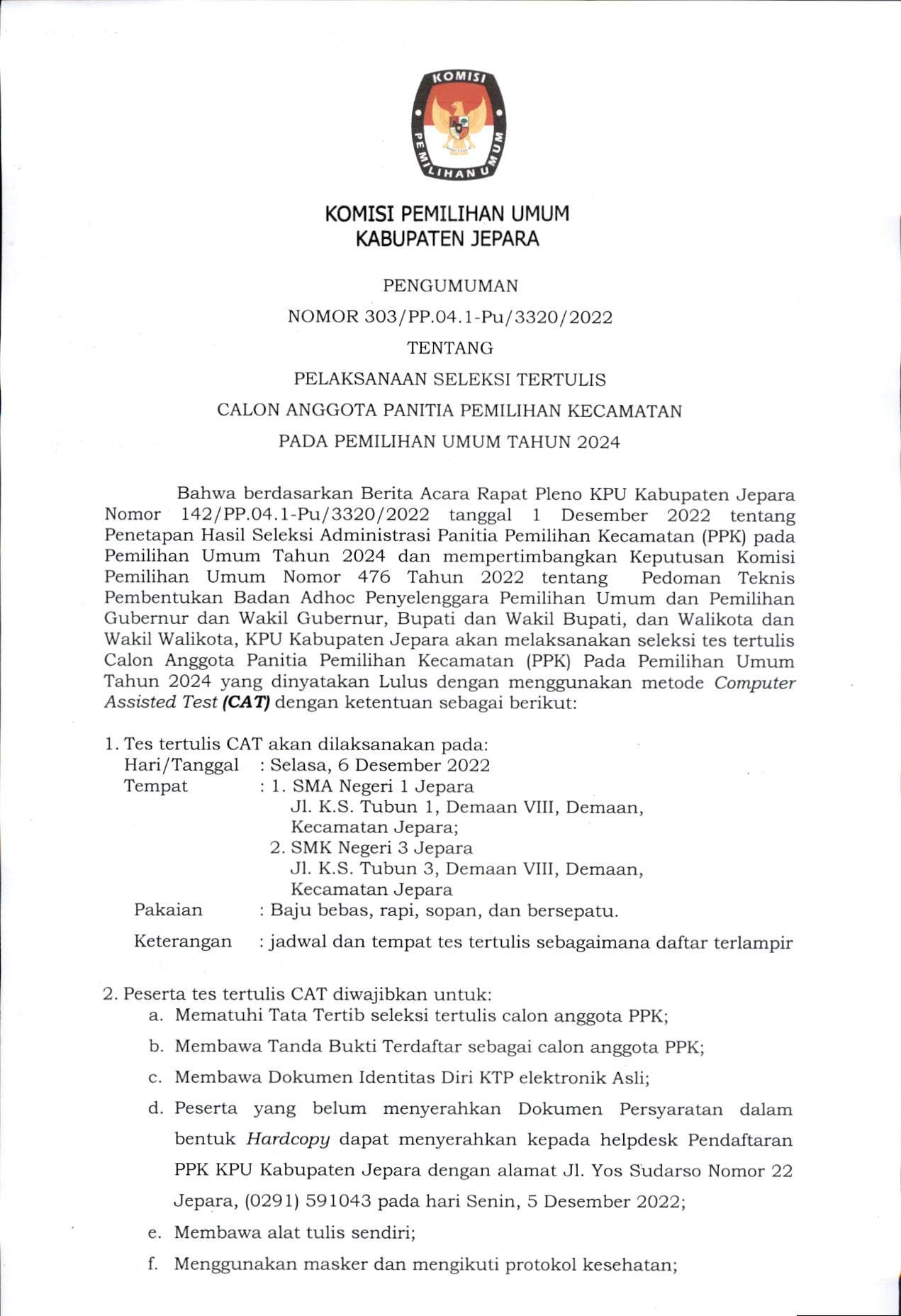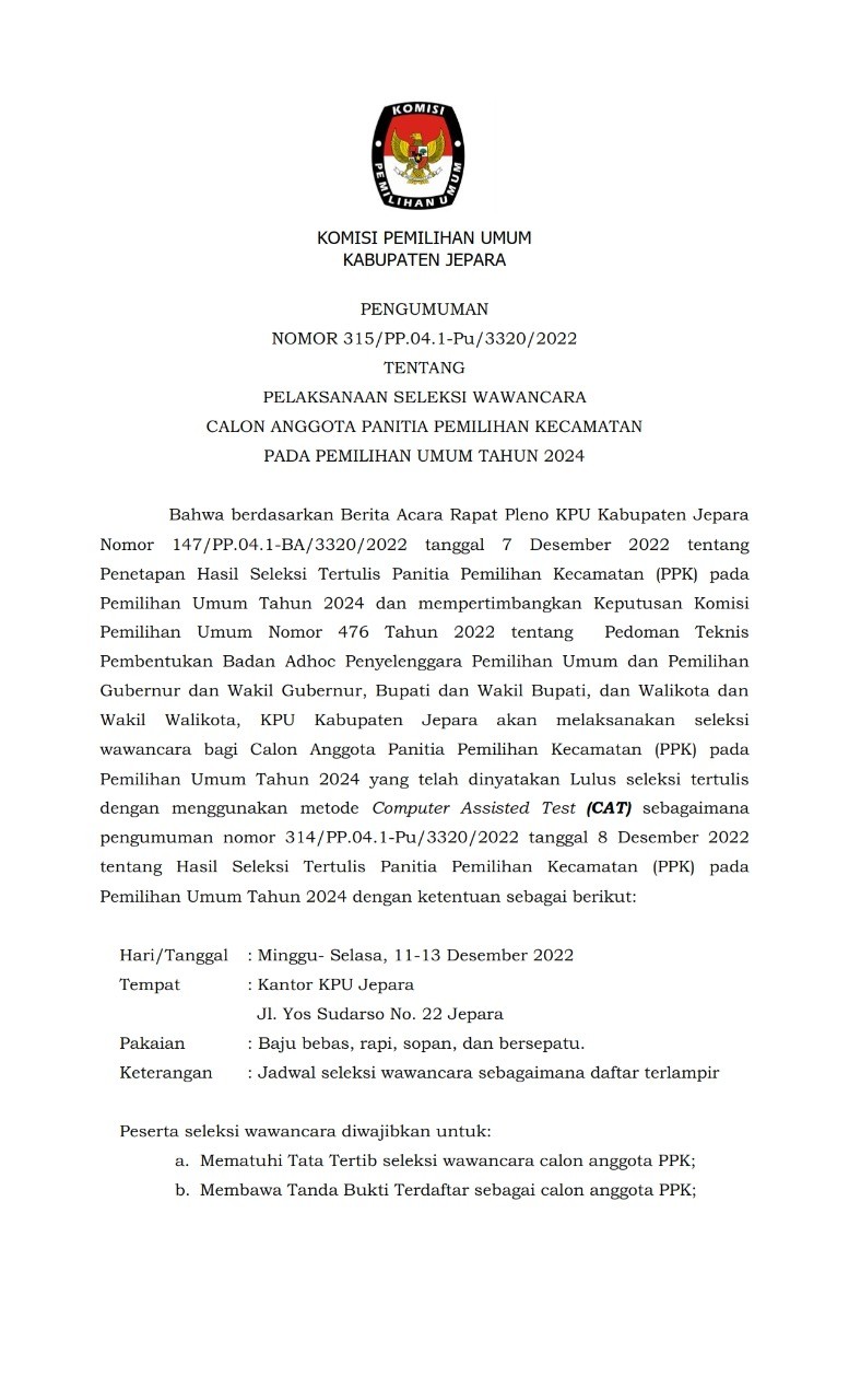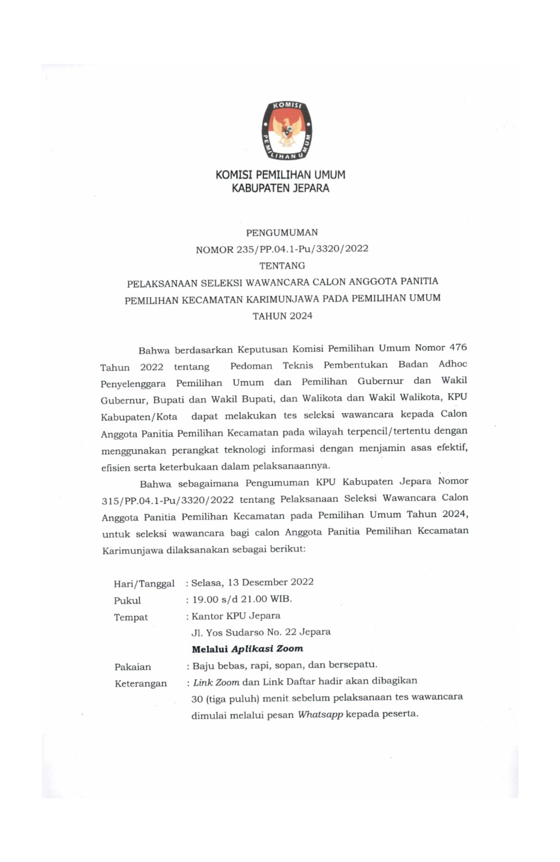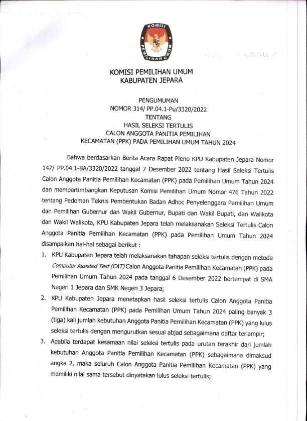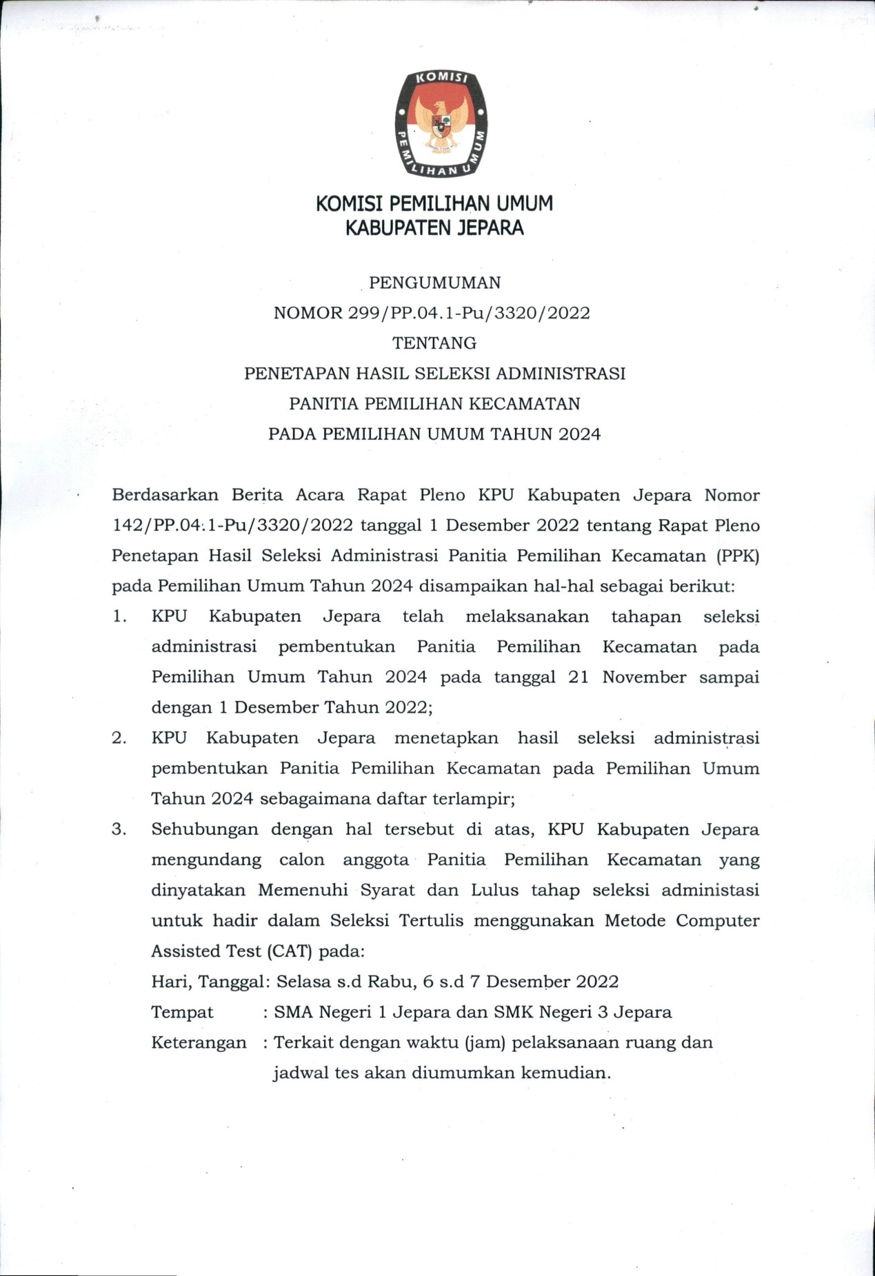 Pengumuman Nomor 299/PP.04-1-PU/3320/2022 tentang Penetapan Hasil Seleksi Administrasi Panitia Pemilihan Kecamatan pada Pemilihan Umum Tahun 2024.
