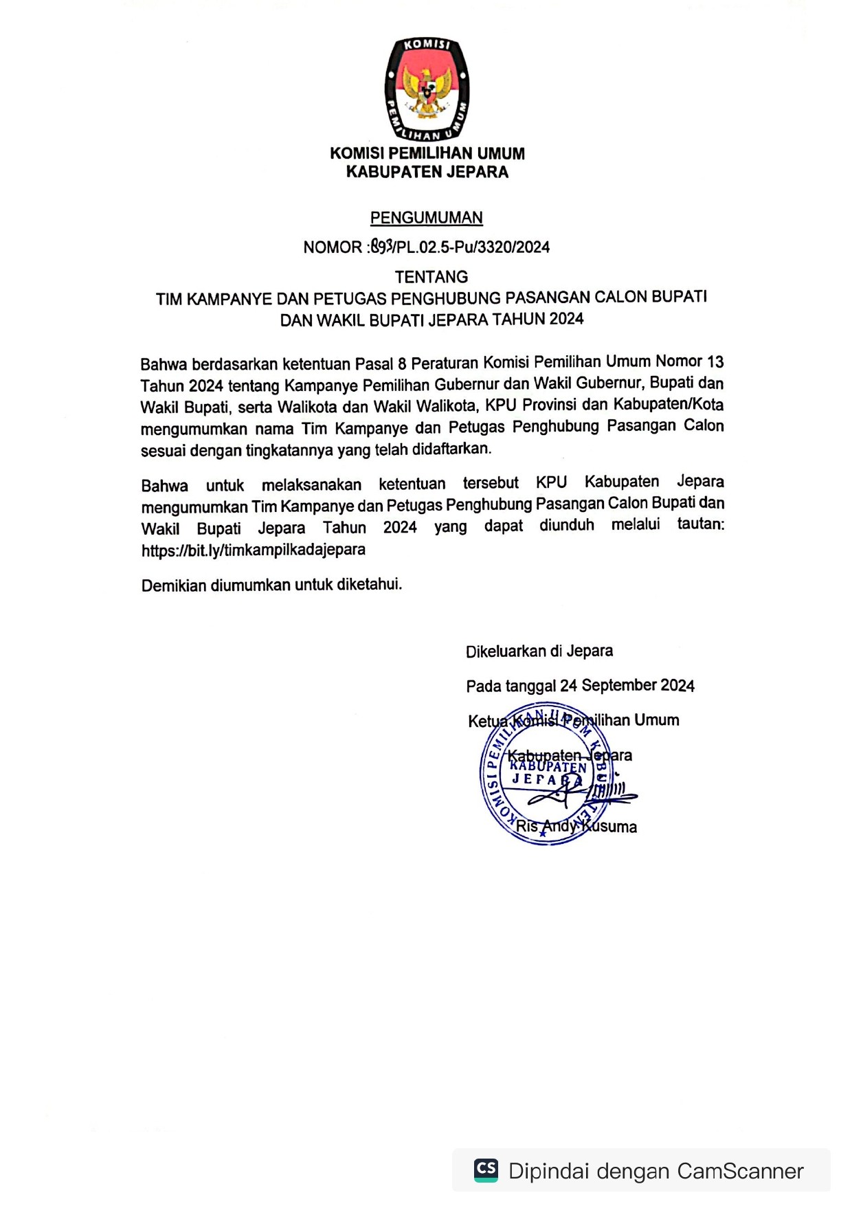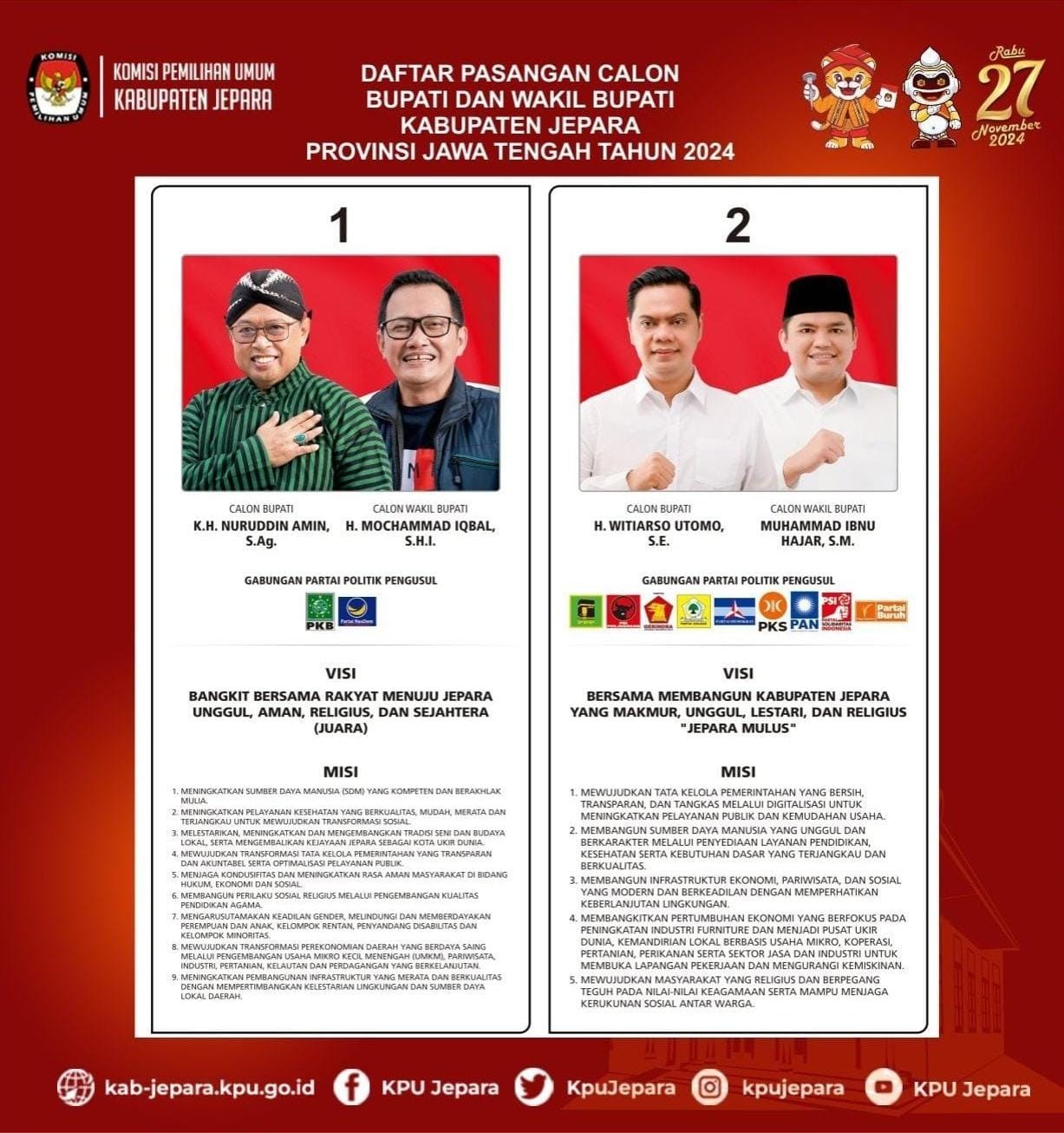 Berikut adalah Keputusan KPU Kabupaten Jepara Nomor 1180 Tahun 2024 tentang Penetapan Pasangan Calon Peserta Pemilihan Bupati dan Wakil Bupati Jepara Tahun 2024. KLIK DISINI