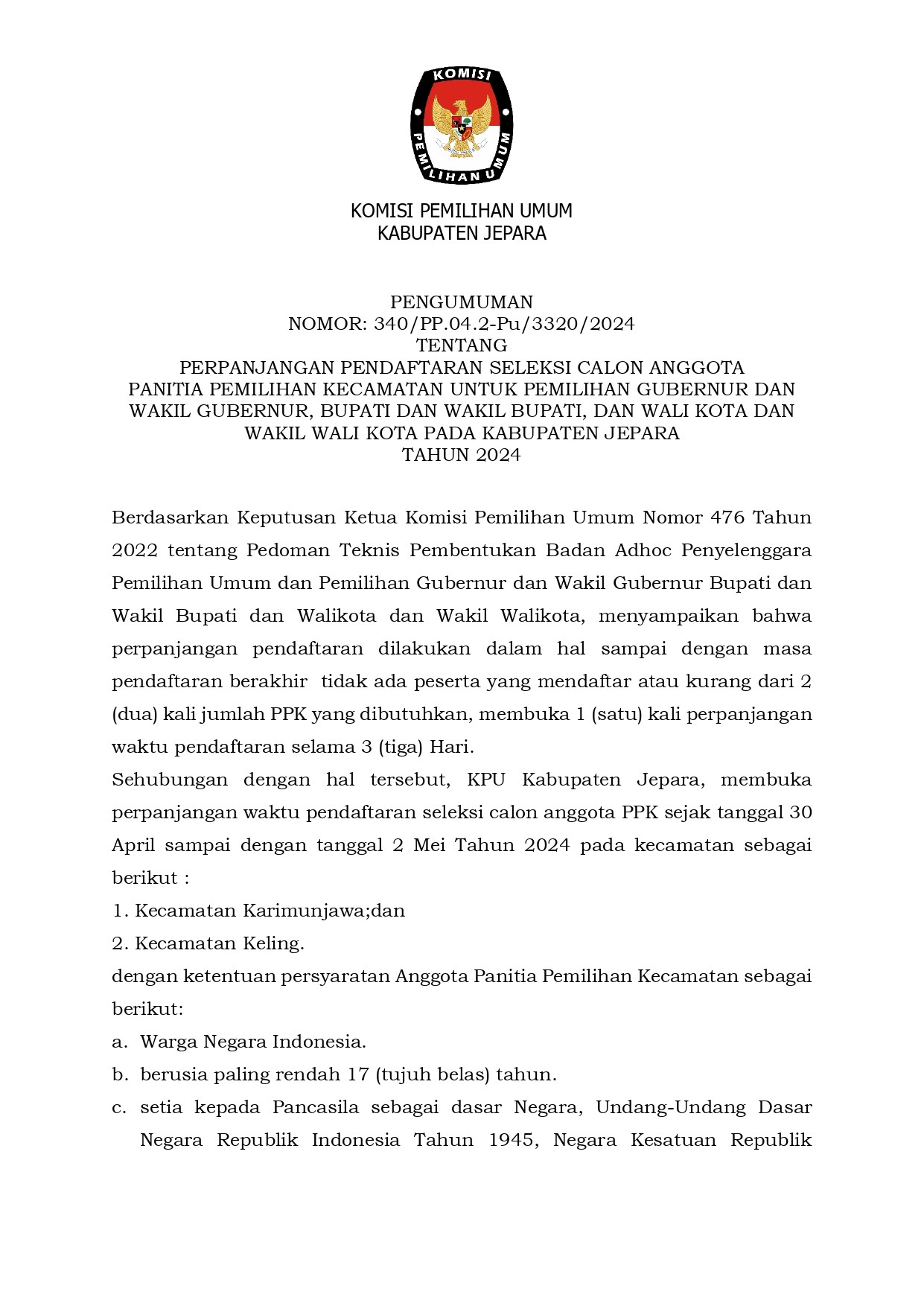 Berikut ini adalah Pengumuman Perpanjangan Pendaftaran Seleksi Calon Anggota PPK pada Pilkada 2024 di Kabupaten Jepara.
