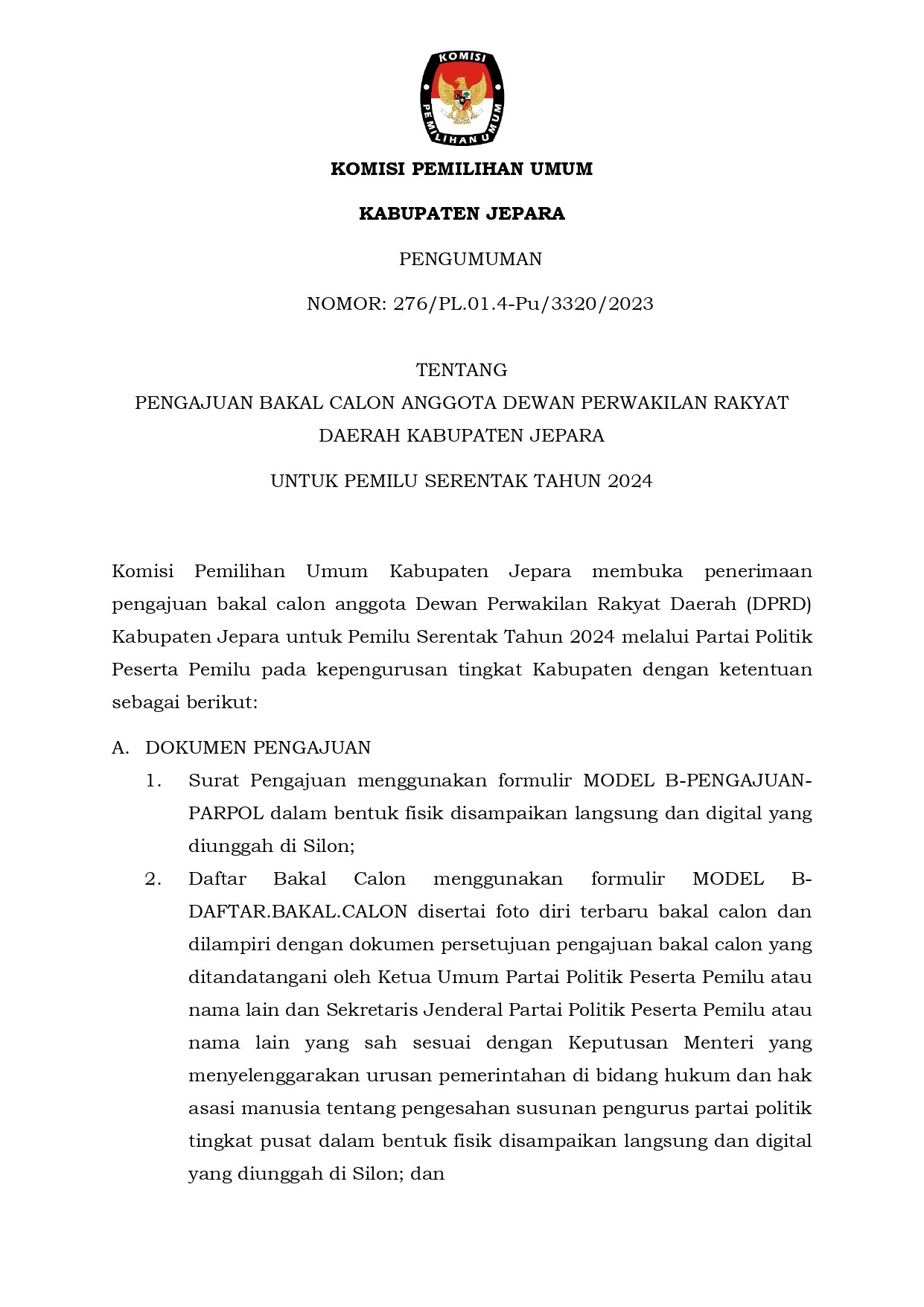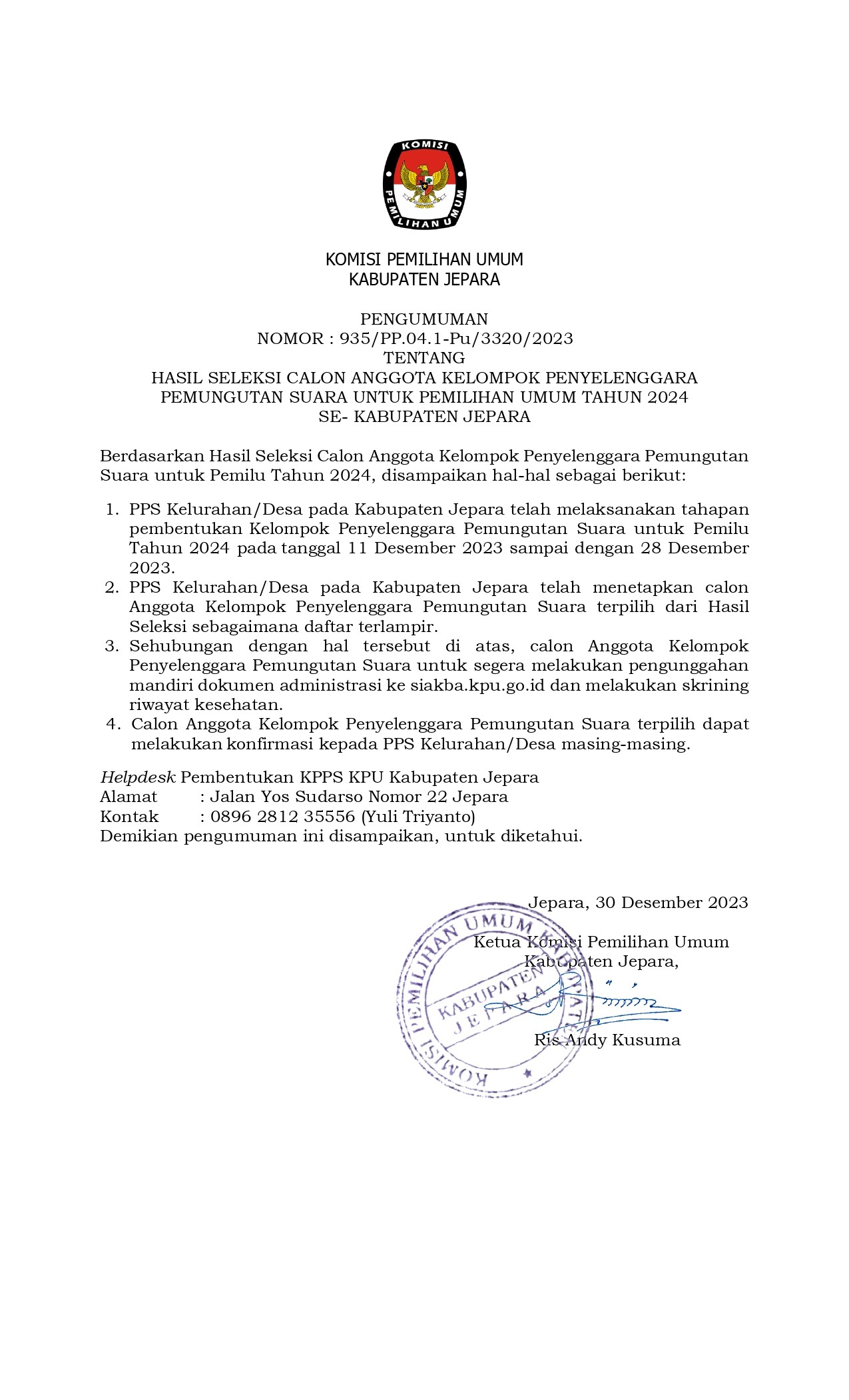 Berikut adalah Perubahan Atas Pengumuman Nomor: 922/PP.04.1-Pu/3320/2023 Tentang Hasil Penelitian Administrasi Calon Anggota KPPS untuk Pemilu 2024 Se-Kabupaten Jepara.