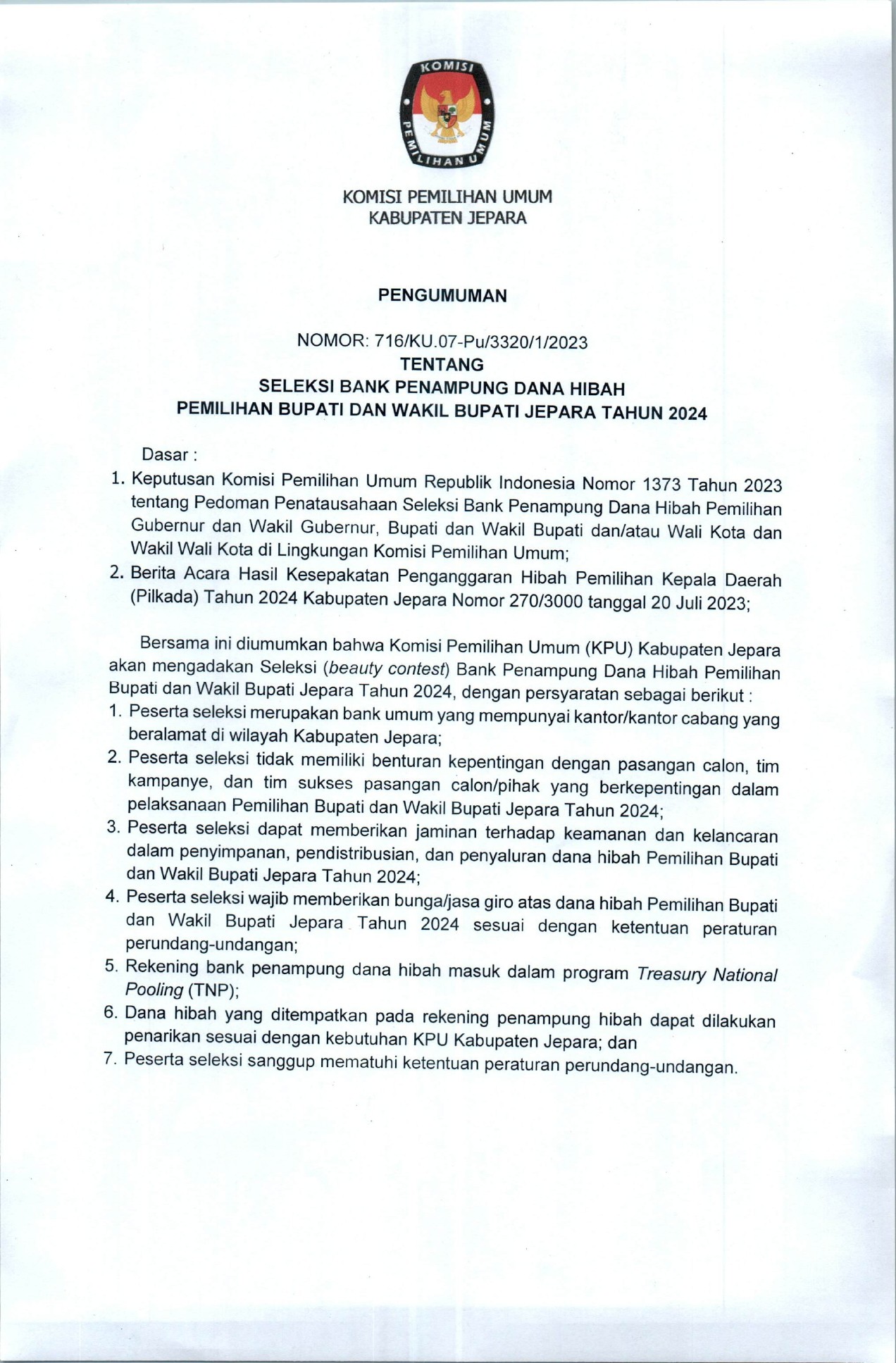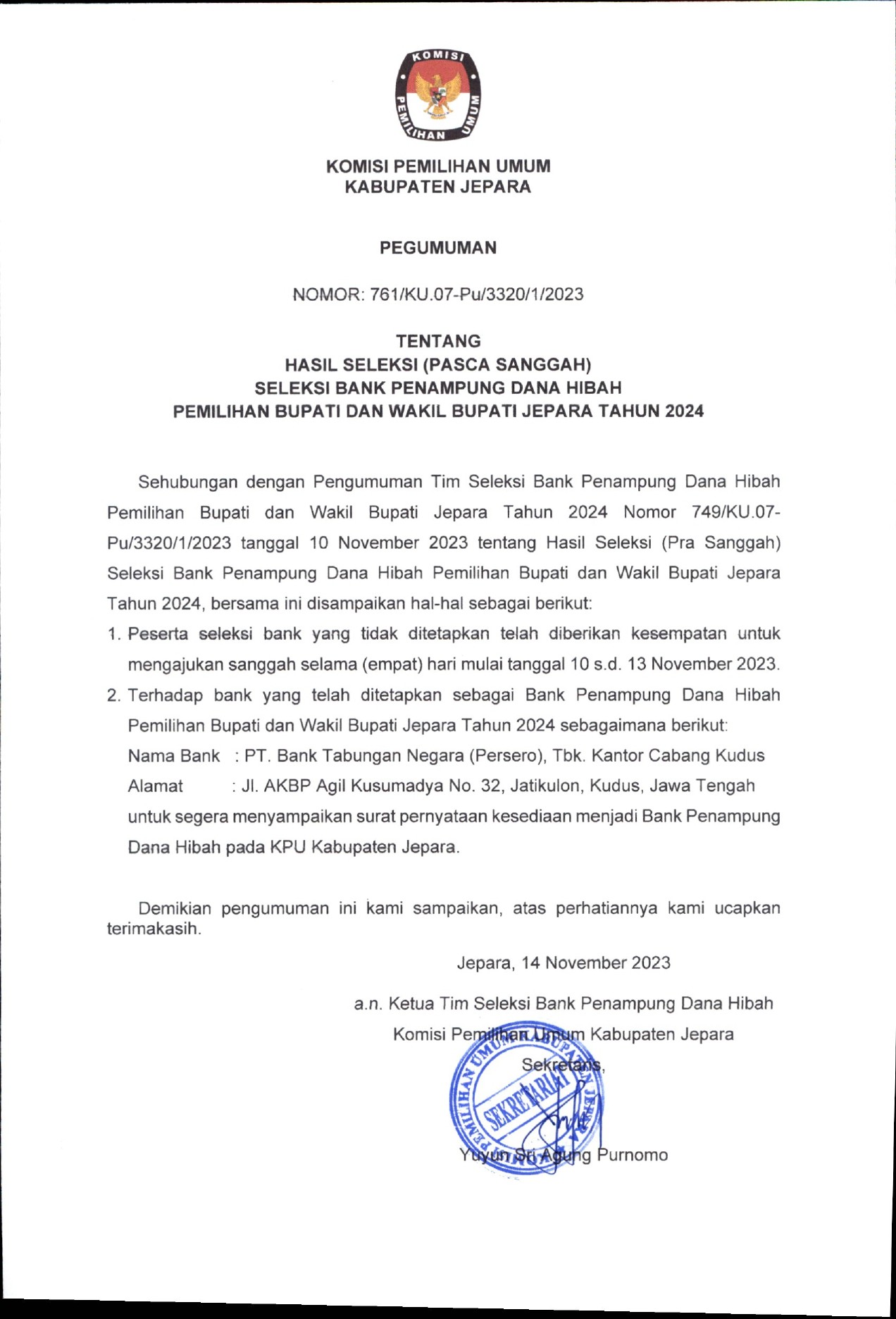 Berikut adalah Hasil Seleksi (Pasca Sanggah) Seleksi Bank Penampung Dana Hibah Pemilihan Bupati dan Wakil Bupati Jepara Tahun 2024.