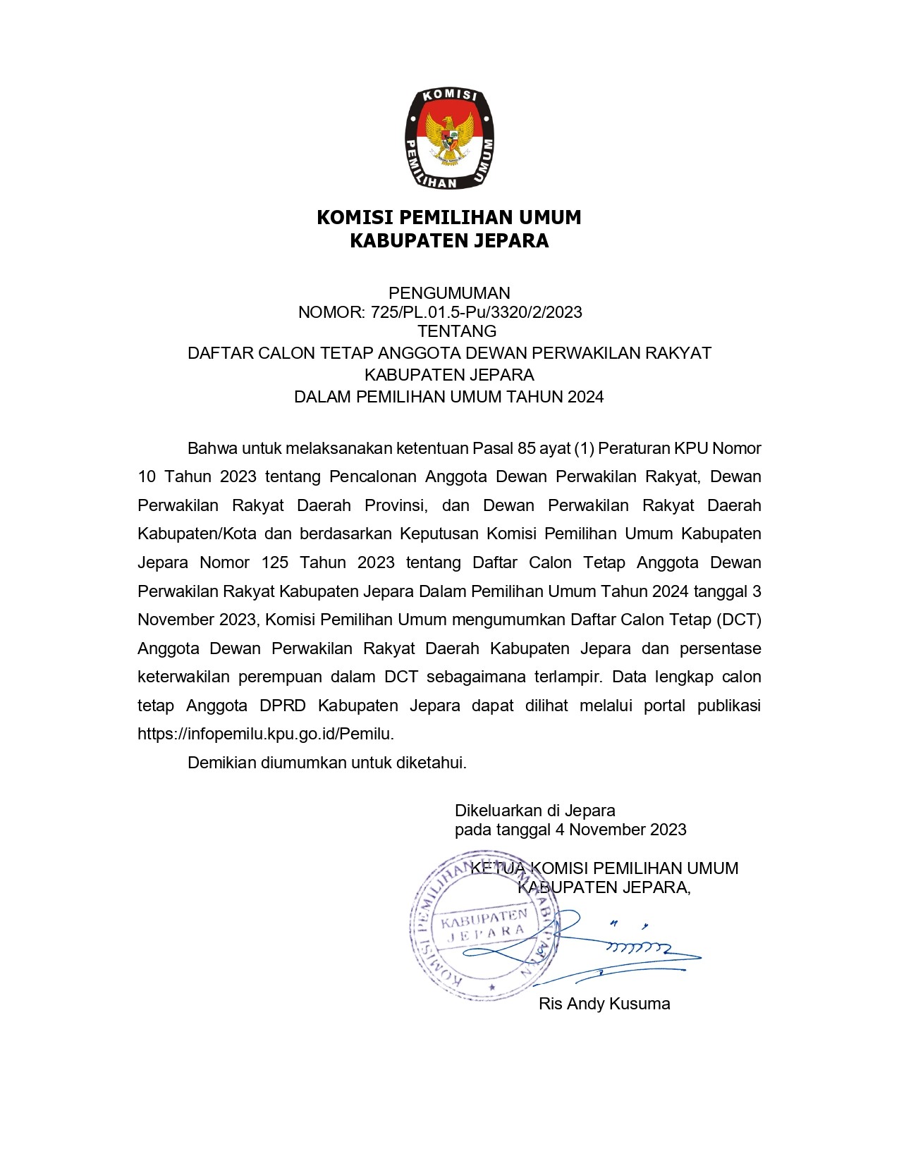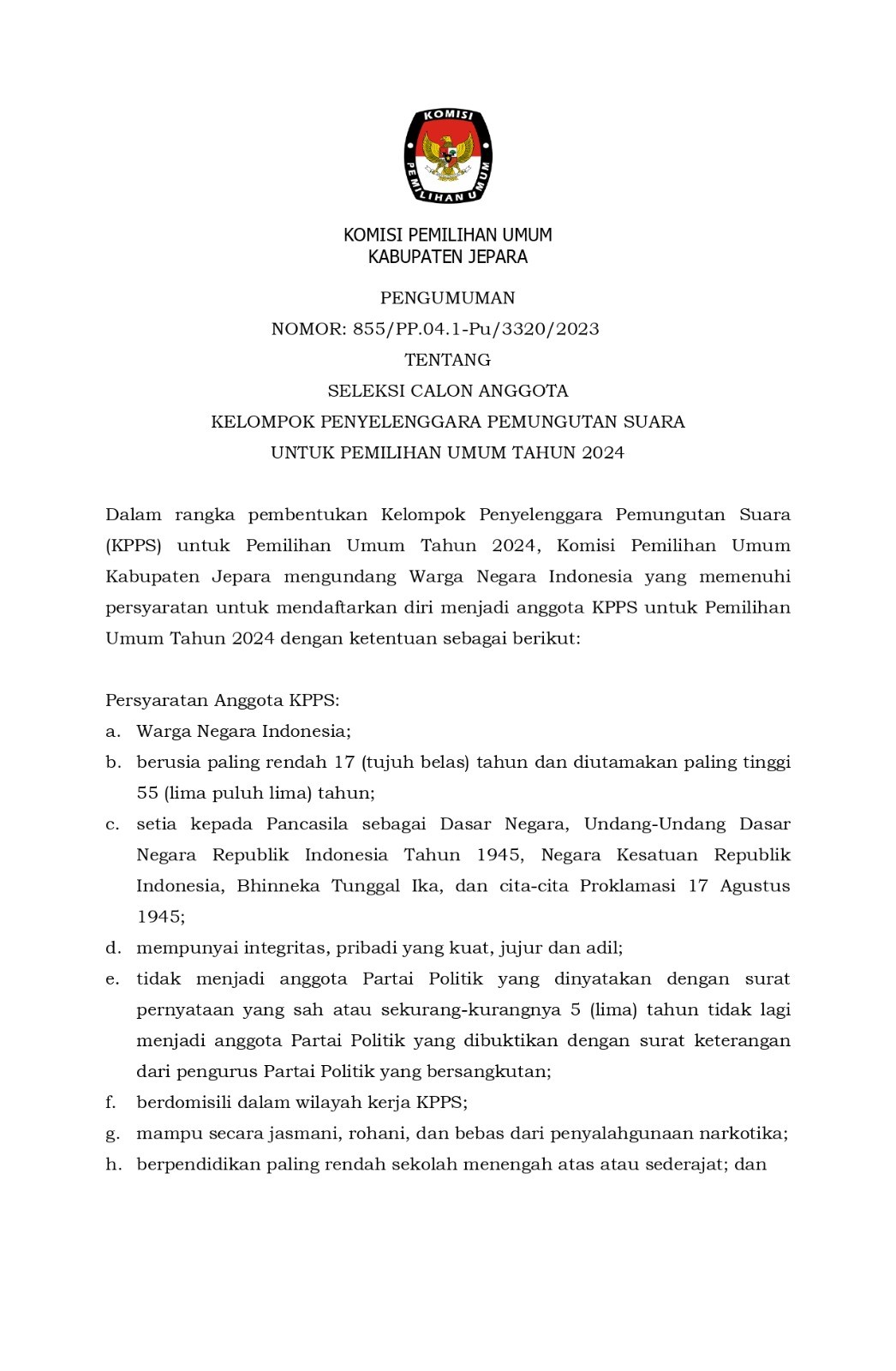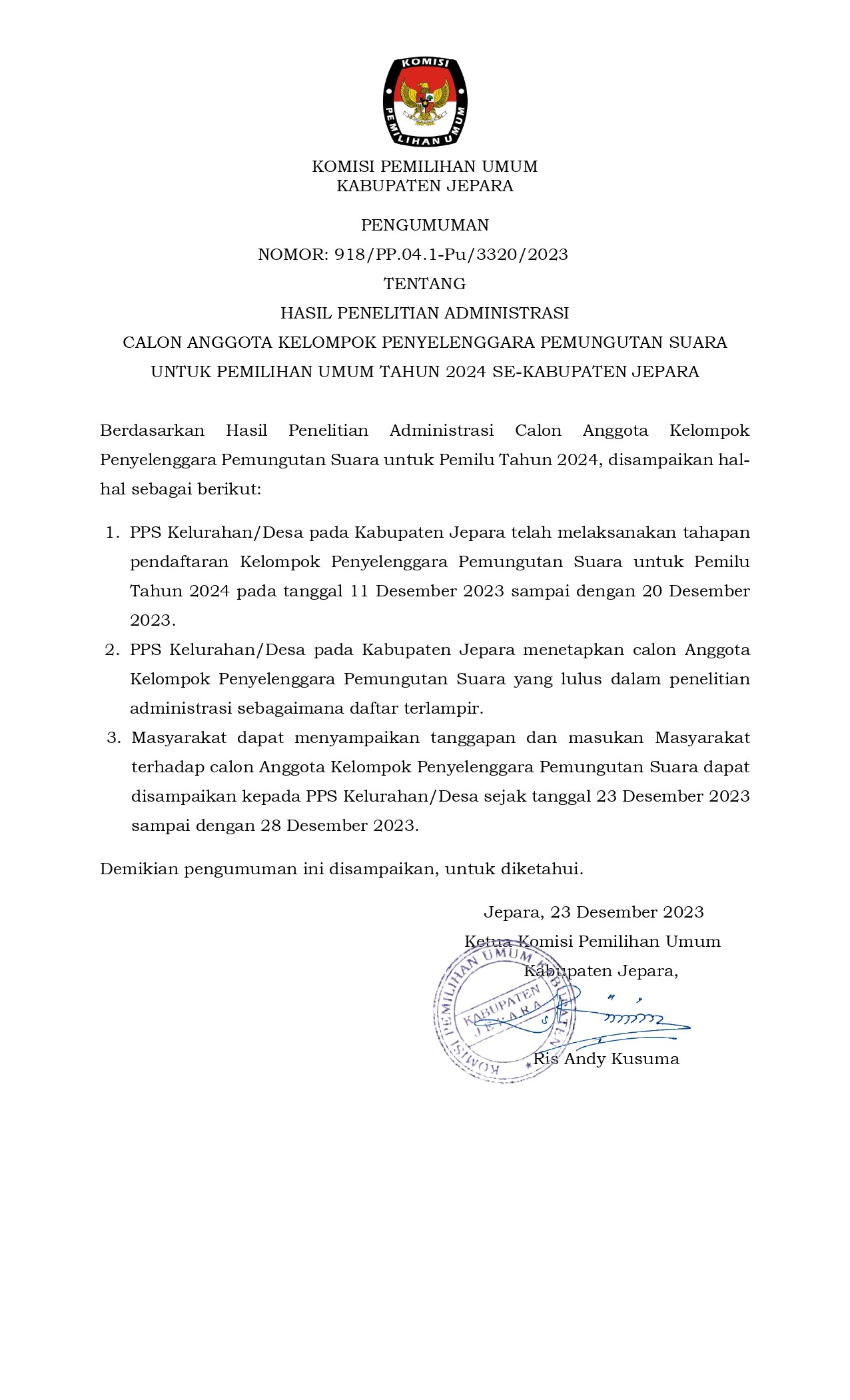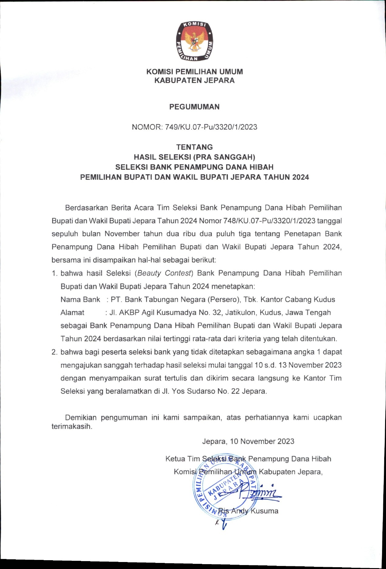 Berikut adalah Pengumuman Hasil Seleksi (Pra Sanggah) Seleksi Bank Penampung Dana Hibah Pemilihan Bupati dan Wakil Bupati Jepara Tahun 2024.